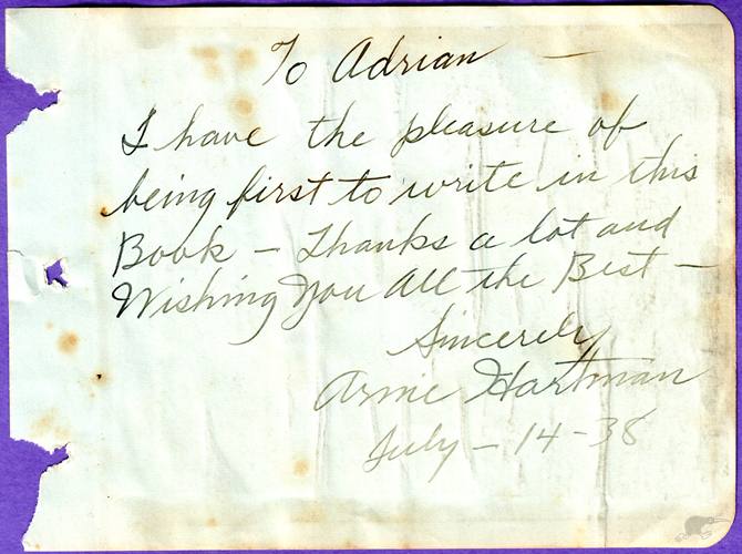 AUTOGRAPH USA ARNIE HARTMANN ACCORDIONIST SIGNED PAGE