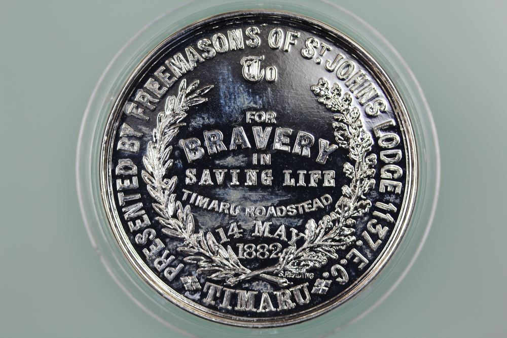 Obverse: PRESENTED BY FREEMASONS OF ST JOHNS LODGE 1137.E.C +TIMARU TO / FOR / BRAVERY / IN / SAVING LIFE / TIMARU ROADSTEAD / 14 MAY / 1882