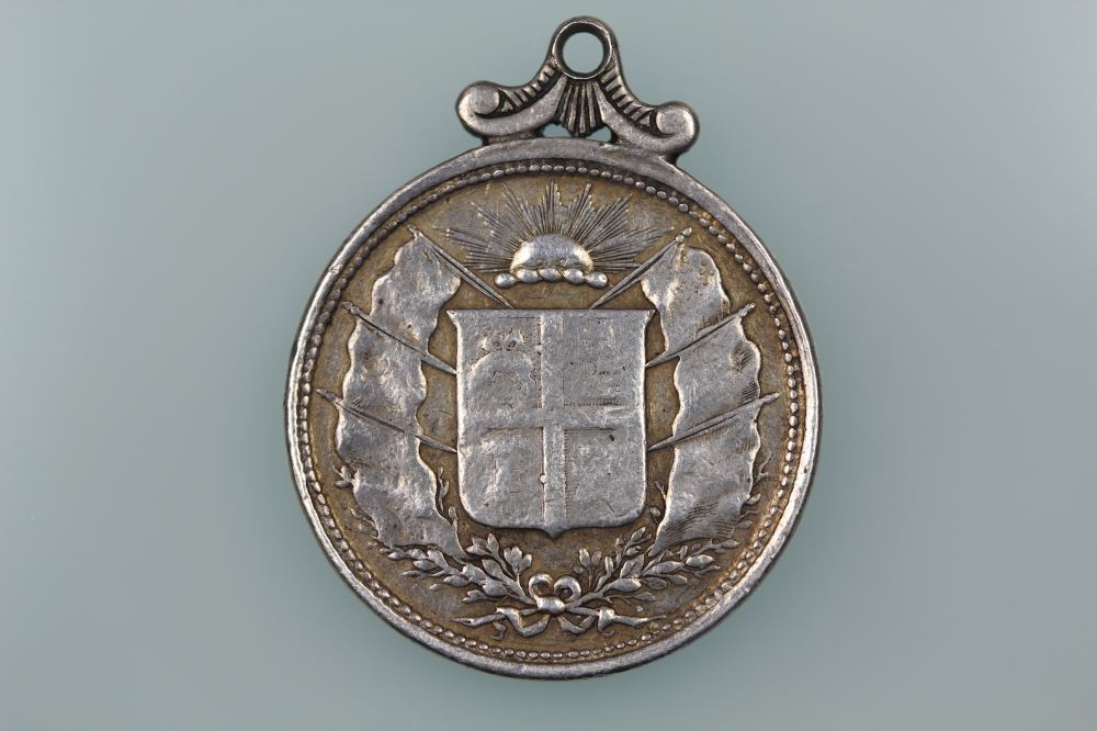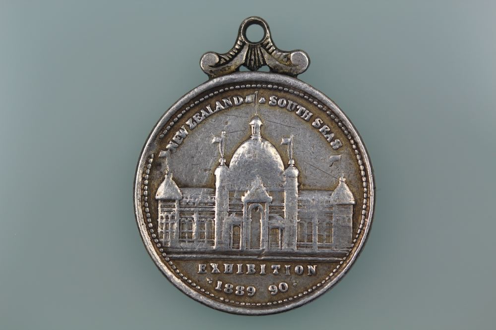 NZ SOUTH SEAS EXHIBITION 1889-90 DUNEDIN MEDALLION SILVERMOREL 1889-90/2Obverse: NEW ZEALAND AND SOUTH SEAS EXHIBITION /:1889-90:Reverse: Coat of Arms22.5 mm diameter, silver, link suspension Morel Rarity Rating R4 = scarce