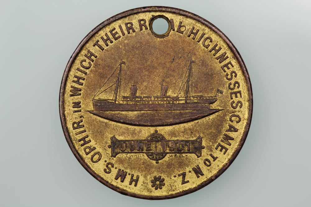 Obverse: H.M.S OPHIR IN WHICH THEIR ROYAL HIGHNESSES CAME TO N.Z. / JUNE 1901; variation no smoke, points of water level with I of IN