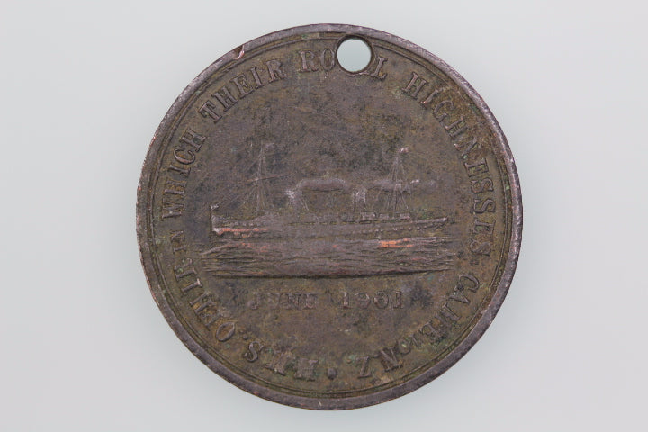 Obverse: H.M.S OPHIR IN WHICH THEIR ROYAL HIGHNESSES CAME TO N.Z. /JUNE 1901