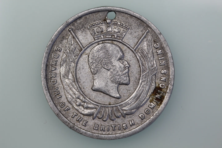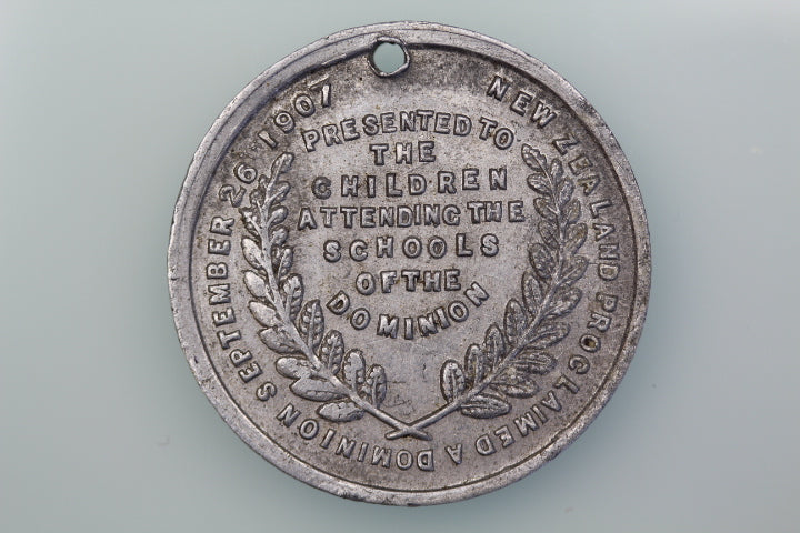 Obverse: EDWARD VII OF THE BRITISH DOMINIONS KING, 7 pearls to the left arch of the crown Reverse: NEW ZEALAND PROCLAIMED A DOMINION SEPTEMBER 26TH 1907 / PRESENTED TO / THE /CHILDREN / ATTENDING / THE / SCHOOLS / OF THE / DOMINION, 10 leaves on the fern fronds