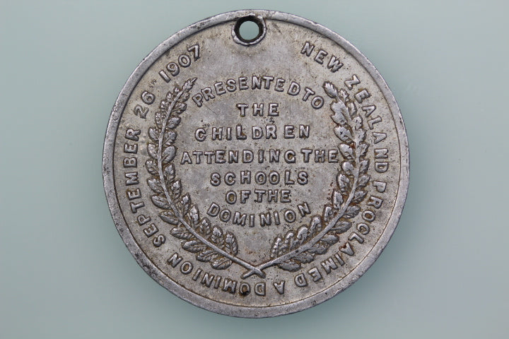 Reverse: NEW ZEALAND PROCLAIMED A DOMINION SEPTEMBER 26TH 1907 / PRESENTED TO / THE /CHILDREN / ATTENDING / THE / SCHOOLS / OF THE / DOMINION,