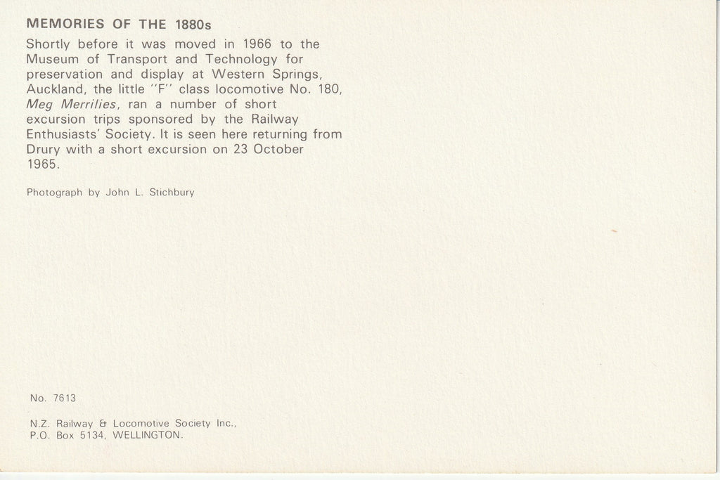 NZ LOCOMOTIVE "Meg Merrilies" "F" CLASS No. 180 23 October 1965 Auckland Photography by John L. Stichbury Produced by N.Z. Railway & Locomotive Society Inc. Mint unused