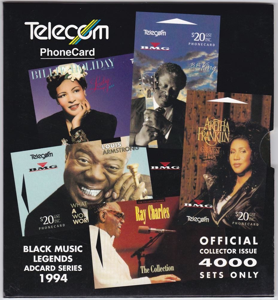 1994 BLACK MUSIC LEGENDS SET ADCARD SERIES TELECOM PHONECARDS Only 4000 of this Adcard collector pack issued. 5 x $20.00 showing Louis Armstrong, Billie Halliday, Ray Charles, B.B.King, Aretha Franklin