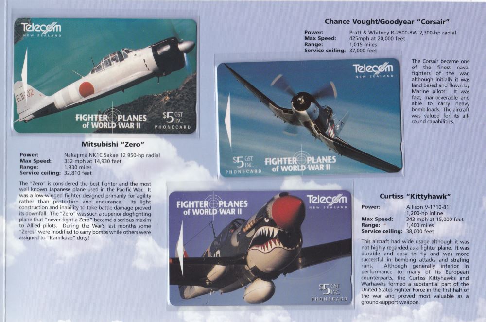 FIGHTER PLANES OF WWII IN PACIFIC FOLDER Airshow pack , only 1000 issued6 x $5.00 phonecards in the folderplanes depicted Spitfire, Mustang, Messerschmitt, Zero, Kittyhawk and Corsair All cards mint unused