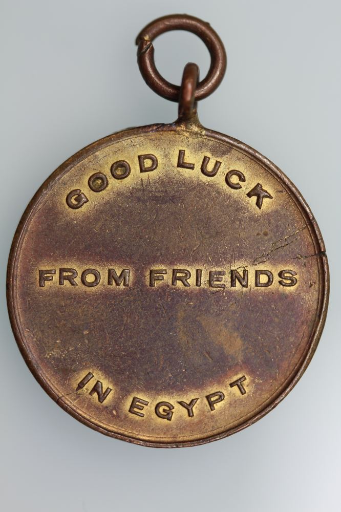 EGYPT WWII 1942 CHRISTMAS STOCKING GOOD LUCK MEDALObverse: GOOD LUCK / FROM FRIENDS / IN EGYPTReverse: XMAS STOCKING / 1942Diameter 26.8 mm, gilt on bronze