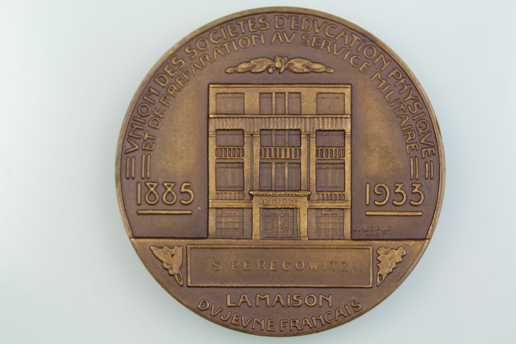 Obverse: UNIONDES SOCIETES DEDUCATION PHYSIQUE/ ET DE PERPARATION AU SERVICE MILITAIRE/ 1885 1933/ S. PERECOWITZ/ LA MAISON DUJEUNE FRANCAIS