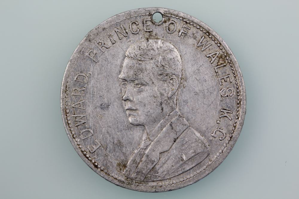 GB EDWARD PRINCE OF WALES COLONEL WELSH GUARDS MEDAL Obverse: EDWARD PRINCE OF WALES K.G. Reverse: H R H / PRINCE OF WALES / BORN JUNE 23RD 1894 / COLONEL / OF / WELSH GUARDS Diameter 26 mm struck in aluminum and pierced