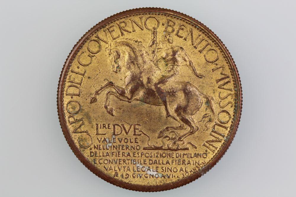 ITALY 1928 BENITO MUSSOLINI & VICTOR EMANUELLE III MEDALObverse: CAPO. DEL. GOVERNO BENITO MUSSOLINI / LIRE DUEReverse: REGNANDO VITTORIO EMANUELE III, 1928Diameter 30 mm, gilt