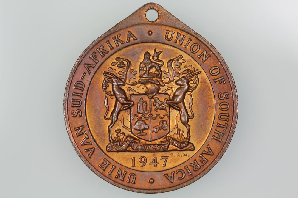 SOUTH AFRICA ROYAL VISIT 1947 MEDAL BRONZEObverse: ROYAL VISIT KONIN KLIKE BESOERReverse: UNIE VAN SUID-AFRIKA UNION OF SOUTH AFRIKA / 1947Diameter 32.6 mm, bronze with loop suspension