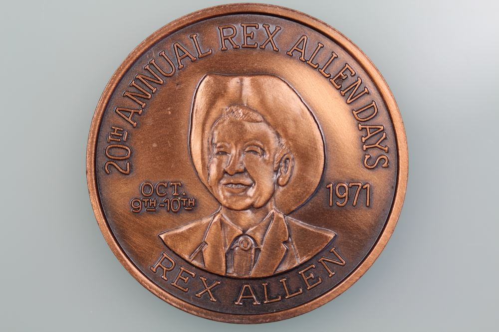USA WILCOX ARIZONA REX ALLEN DAYS RODEO MEDAL Obverse: 20TH ANNUAL REX ALLEN DAYS / OCT 9TH + 10TH 1971 / REX ALLEN.Reverse: REX ALLEN DAYS RODEO ASSOCIATION INC. / WILLCOX ARIZONADiameter 39 mm, in bronze